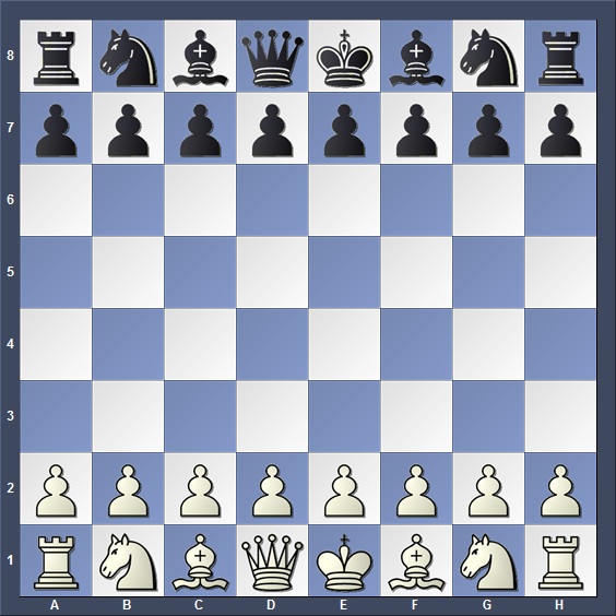 Para iniciar siempre debemos situar las piezas blancas en la filas 1 y 2, mientras que las piezas negras deben ir en las filas 7 y 8. Como lo vemos a continuación: