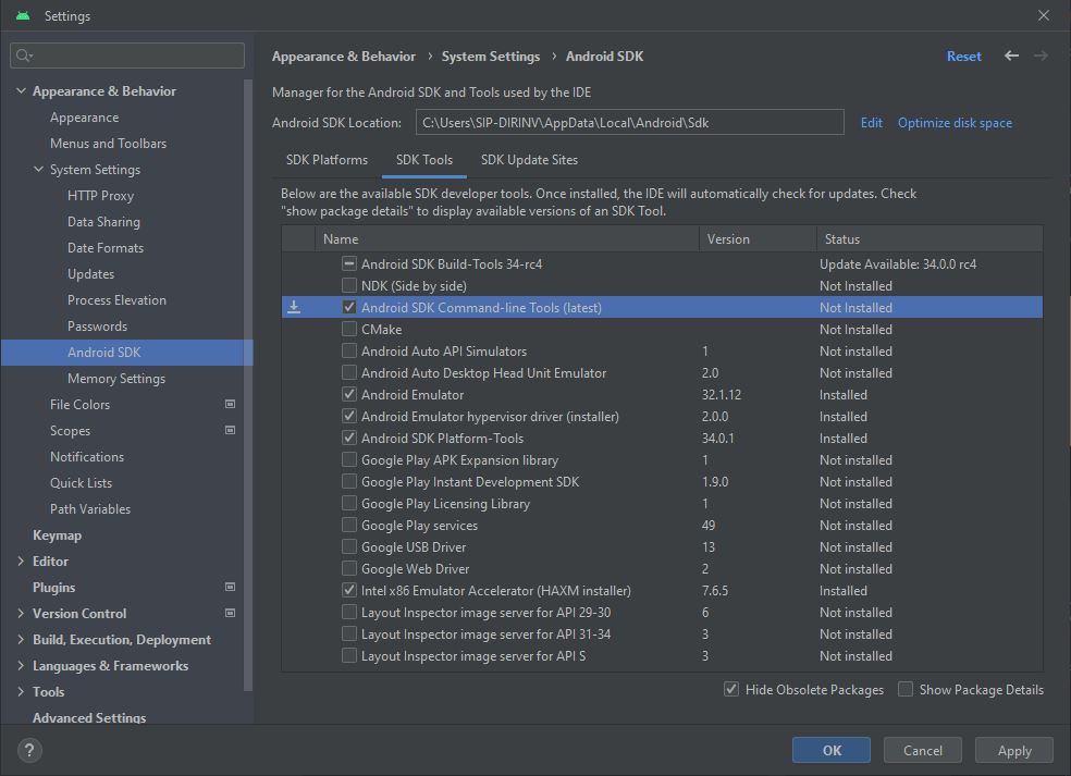 Android SDK, pestaña SDK Tools, instale....> Android SDK Command-line Tools (latest).